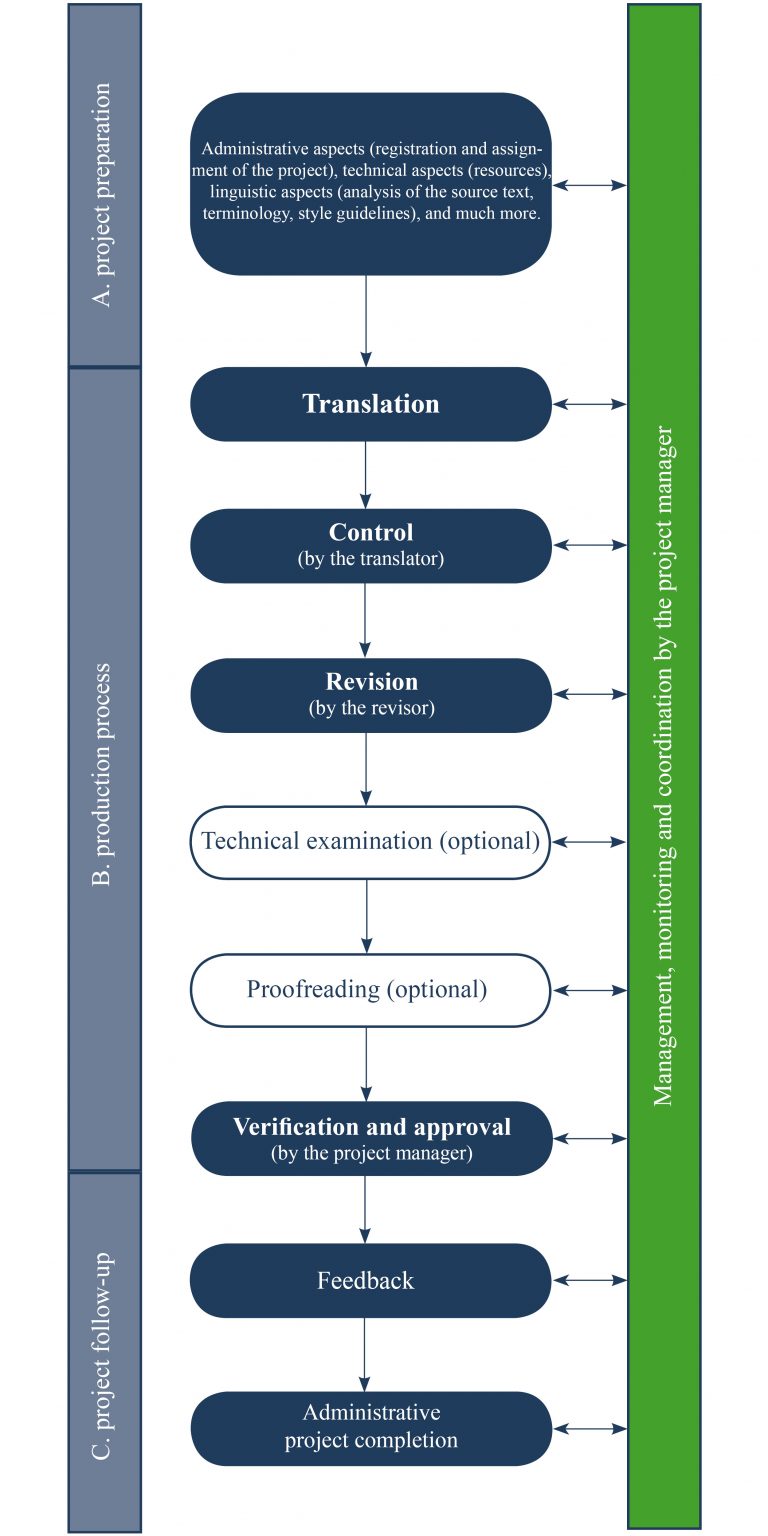 As in the basic ‘Standard’ model, the translation process is divided into three phases: A. Project preparation, B. Production process, C. Project follow-up. In the basic ‘ISO 17100’ model, a project manager is also responsible for managing and monitoring the translation process. This person is also the first point of contact for questions and acts as an intermediary between customers and producers.